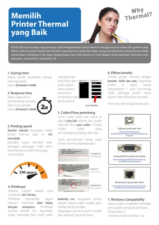 Pilihlah printer thermal dengan koneksi lebih dari satu. Mayoritas printer di pasar hanya menyediakan 1 port (umumnya USB), Sehingga printer harus diganti saat kebutuhan berubah.